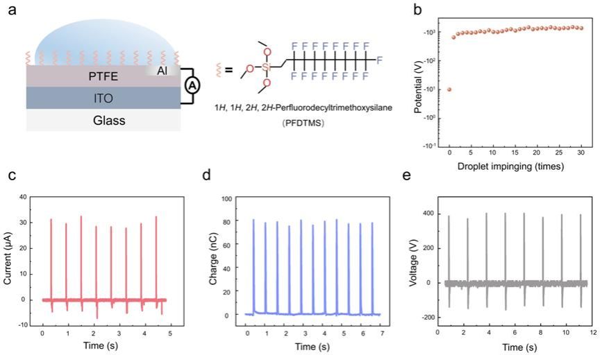 实现具有快速起电过程的高输出水滴摩擦电纳米发电机仍然面临挑战。我们提出了一种通过策略性表面分子修饰的方法,以提高水滴摩擦电纳米发电机的输出特性。通过对摩擦层表面分子进行修饰,我们成功降低了电子从水分子转移到聚合物分子的能垒,加速了电子转移过程,从而提高了起电速度。仅通过5滴水的撞击和接触,摩擦层的表面电势就可以达到其最终饱和表面电势的85%。此外,该方法有效增加了固-液接触位点,提升了摩擦层的饱和表面电势。最终制备的功能化水滴摩擦电纳米发电机展现出优异的输出特性。该研究成果以Elevating Outputs of Droplet Triboelectric Nanogenerator through Strategic Surface Molecular Engineering为题在国际学术期刊ACS Energy Letters上发表。草莓视频