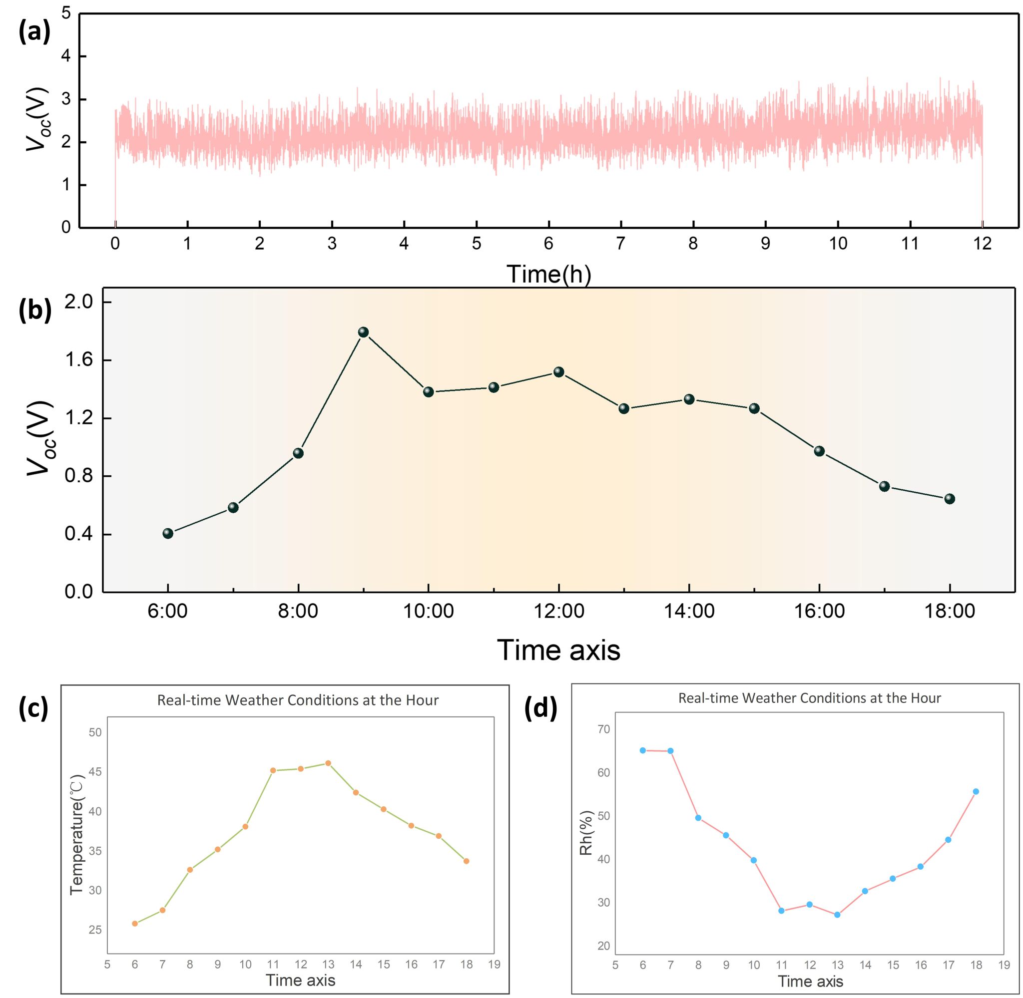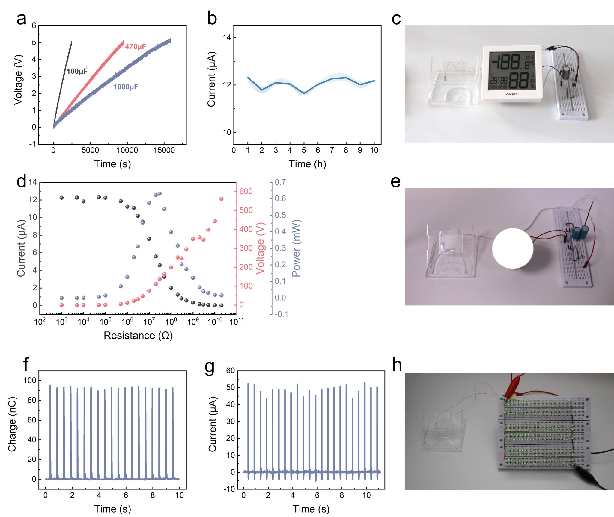 此外,MOF-801由于其高孔隙率、带电表面和亲水性被我们尝试用于水伏发电。通过利用基于MOF-801薄膜的功能化纳米通道,自然蒸发可以用来生成电能。器件能够产生大约2.2 V的开路电压和1.9 μA的短路电流,并在自然环境中表现出良好的工作稳定性。该研究成果以Harnessing Natural Evaporation for Electricity Generation using MOF-Based Nanochannels为题在国际学术期刊Small上发表。草莓视频