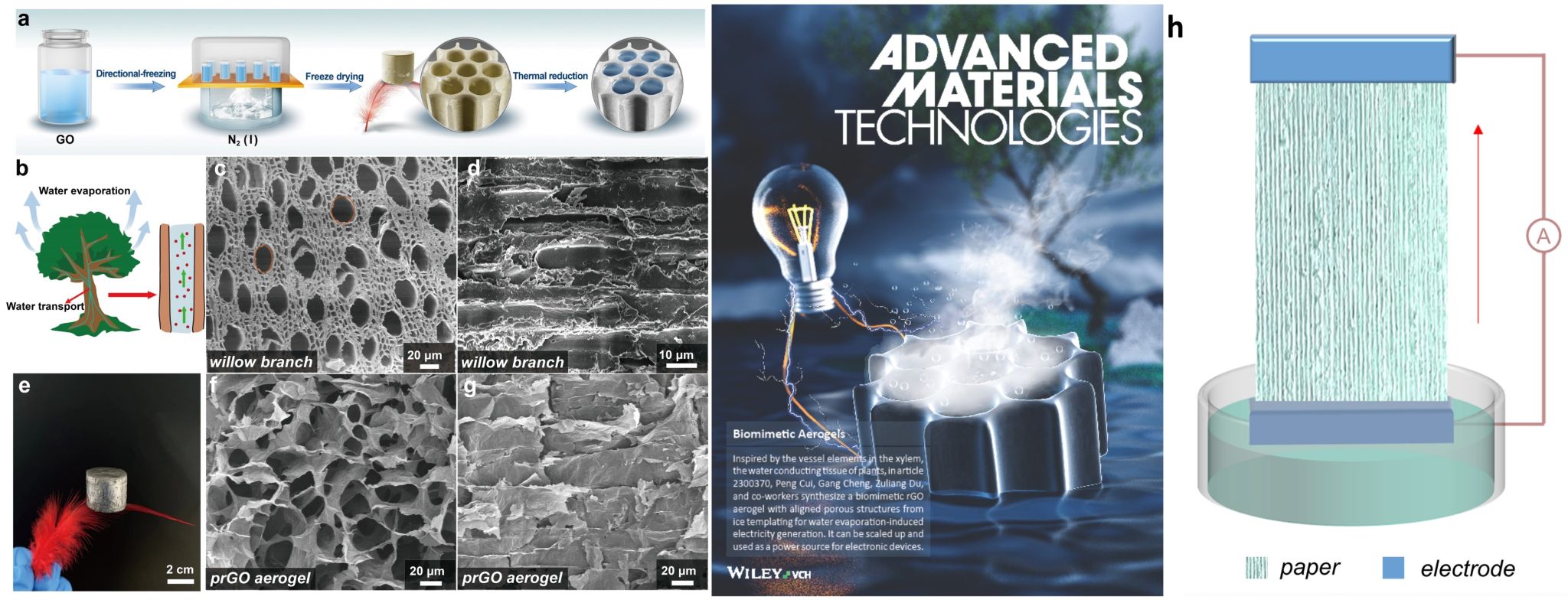 另一方面,受木本植物木质部中导管结构的启发,在定向冰模板的辅助下,我们制备了具有对齐多孔结构的仿生石墨烯气凝胶。由于具有优异的蒸发输水率,有效地提高了水伏发电的性能。该研究成果以Biomimetic Aerogel with Aligned Porous Structures from Ice Templating for Water Evaporation-Induced Electricity Generation为题在国际学术期刊Advanced Materials Technologies上发表。该研究成果被国际仿生工程学会推荐报道。草莓视频