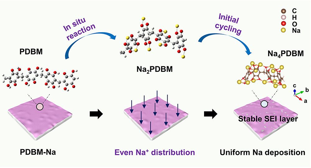 针对上述问题,我们在Na/Li金属表面引入功能性醌类聚合物(聚(2,5-二羟基-1,4-苯醌-3,6-亚甲基),PDBM),形成了均匀分布的柔性聚合物-盐(PDBM-Na/Li)基SEI层。PDBM-Na层具有富集Na+的特点和较低的离子解离能,使得PDBM-Na||PDBM-Na对称电池表现出较低的过电位和稳定的钠金属电镀/剥离行为(在2 mA cm-2和5 mA cm-2电流密度下均可循环超过1000小时)。此外,通过对Na/Li金属上PDBM-Na/Li层保护性能的研究表明,适当的离子吸附能和较低的解离能对延长金属电极的循环寿命具有重要影响。这项研究为发展基于功能聚合物结构设计的碱金属负极保护策略提供了参考价值。