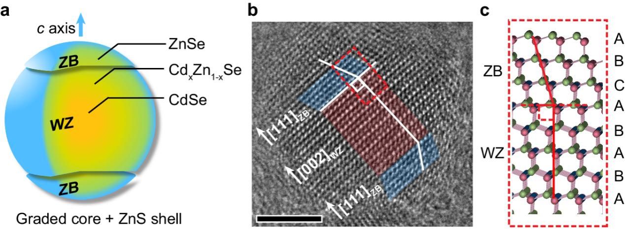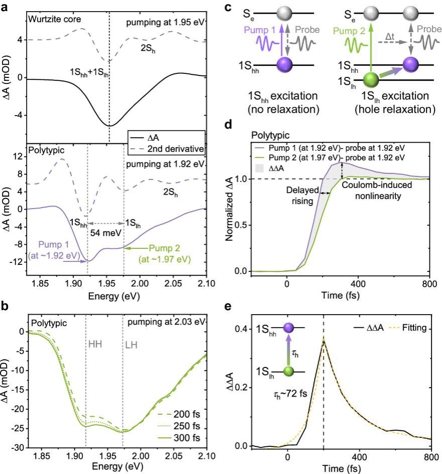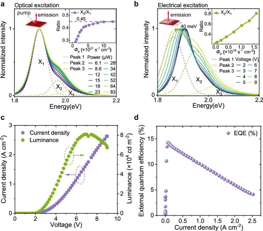 申怀彬教授与中国科学技术大学樊逢佳教授合作,在闪锌矿-纤锌矿复合结构CdZnSe量子点发光二极管(QD-LED)结构中实现了热平衡状态下的高能激子的强电致发光。闪锌矿-纤锌矿复合结构量子点中,原本简并的轻空穴与重空穴发生劈裂,轻空穴形成的高能激子与重空穴形成的基态激子在热平衡下同时发光,其强度比例遵循玻尔兹曼分布和相对振子强度的乘积;在电致激发的情况下,轻空穴激子与重空穴激子受到的电场效应影响程度不同,轻空穴激子的相对振子强度进一步提高,从而仅需较低的电流密度(<2.5 A cm-2)与平均电子浓度(每个量子点中平均电子<0.35),即可有效实现高能激子的电致发光,其光强占比最高可达基态发光的80%。相关研究成果以“Strong high-energy exciton electroluminescence from the light holes of polytypic quantum dots”为题,发表在《Nature Communications》杂志上(//doi.org/10.1038/s41467-024-50432-8)。