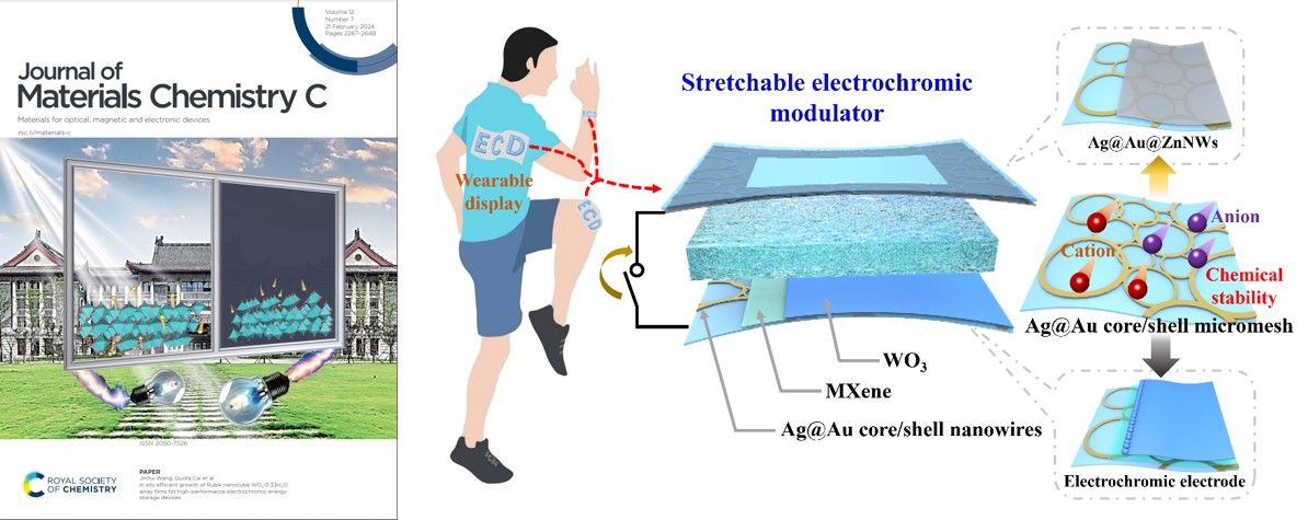 在此基础上,构建WO3基柔性可拉伸电致变色器件,可进一步在柔性显示器、柔性电子标签、智能窗和自适应伪装领域等领域广泛应用。对此,课题组突破传统商用透明导电电极固有脆性的限制,通过无电沉积方法在AgNWs微网上原位生长Au壳层,开发了一种具有高化学稳定性的Ag@Au核/壳纳米线(Ag@AuNWs)微网基导电电极。该电极可以很好的支持WO3薄膜的电致变色过程,经过1000次弯曲循环和拉伸至50%后也能保持良好的电致变色稳定性。该成果以“Highly stable Ag@Au nanowires micromesh as transparent conductive network for stretchable electrochromic modulator”为题发表在Chemical Engineering Journal期刊上(//www.sciencedirect.com/science/article/abs/pii/S1385894724067688)。硕士研究生张萍和博士研究生随晴为第一作者,王金辉老师和蔡国发教授为通讯作者。