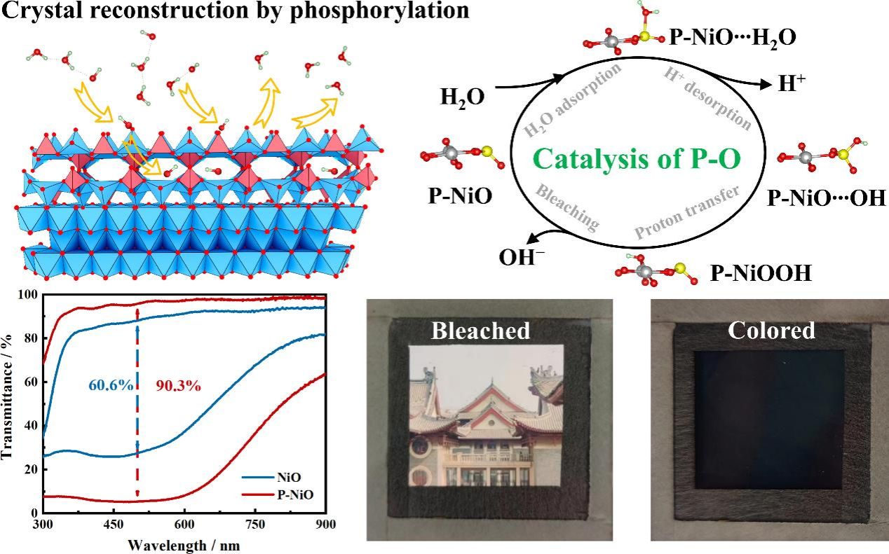 电致变色智能窗在外加电场下可以实现可逆、持久的颜色变化,用于调节室内的光热,对节能建筑和低碳减排具有重要意义。然而,传统金属氧化物电致变色材料的致密结构限制了离子传输效率,电致变色性能较差。基于此,蔡国发课题组提出了一种晶体重构策略,通过磷酸化将致密的立方相氧化镍重构为表面具有大量连续晶格孔腔和表面不饱和键的高活性反应界面,显著提升了材料的电致变色性能。理论模拟和实验结果表明这种重构结构优化了离子传输路径,消除了变色过程对K+的依赖,从而改善了NiO的反应动力学。所得薄膜具有大的光学调制(90.3%,在500 nm),高的着色效率(81.1 cm2 C−1,在500 nm),和快的切换速度(着色和褪色分别为6 s和7.2 s)。结果表明建立的电致变色智能窗户,可以节约60.81 MJ m−2的能耗和减少11.98 kg m-2的碳排放。这种表面晶体重构策略有助于高性能电致变色材料和电化学材料的合理设计与开发。