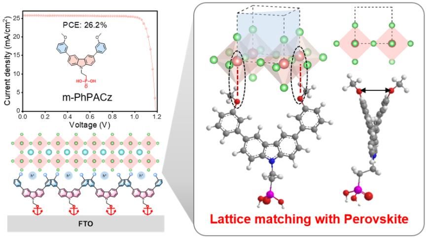 李萌教授团队提出了一种分子异构的策略,用于构筑均匀稳固的分子接触并增强界面稳定性。设计了一系列具有扭曲骨架和可调构型的SAM 异构体,在分子骨架中插入了苯环,以引入结构畸变,有效防止分子自聚集并确保均匀覆盖。甲氧基被有策略地定位于邻位、间位和对位,以调节SAM与钙钛矿的相互作用。其中间位的SAM分子可以与钙钛矿晶格中的对角铅离子实现精准配位,这种精确的匹配有助于增强界面接触减少能量损失并增强界面结构稳定性。优化的钙钛矿器件实现了26.2%的功率转换效率,此外,器件表现出优异的紫外稳定性和热稳定性。这项工作对于设计新型空穴传输层,实现高效稳定钙钛矿太阳能器件提供了新的思路。(DOI: 10.1021/jacs.5c00629)。