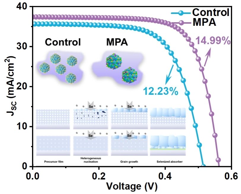 在Cu₂ZnSn(S,Se)₄(CZTSSe)太阳能电池中,次生相的存在以及高浓度深能级缺陷会导致开路电压损失(Voc,deficit)较大,从而限制器件性能的提升。为了改善这一问题,武四新课题组在CZTS向CZTSSe转变的初始硒化阶段调控相演变过程,以获得缺陷和次生相最小化的高质量吸收层。具体而言,我们向在空气氛围制备的2-甲氧基乙醇(MOE)前驱体溶液中引入了具有双齿螯合结构的巯基丙酸(MPA)。通过这种方式,能够制备出尺寸较大的CZTS胶体颗粒以及致密的前驱体薄膜。在初始硒化阶段,由于形核位点的减少,与硒分子之间的碰撞几率和反应降低,从而延长了相演变过程。这一过程的延长使得异质成核过程更加可控,促进了元素分布的均匀性以及贯穿性大晶粒层的生长。这些改进显著提升了器件的效率,最高可达14.99%(经认证为14.38%),并且将开路电压损失降低至281.18 mV。这一研究成果为吸收层结晶和相演化过程调控提供了新的解决途径,对于进一步提升锌黄锡矿太阳能电池的效率具有重要意义。