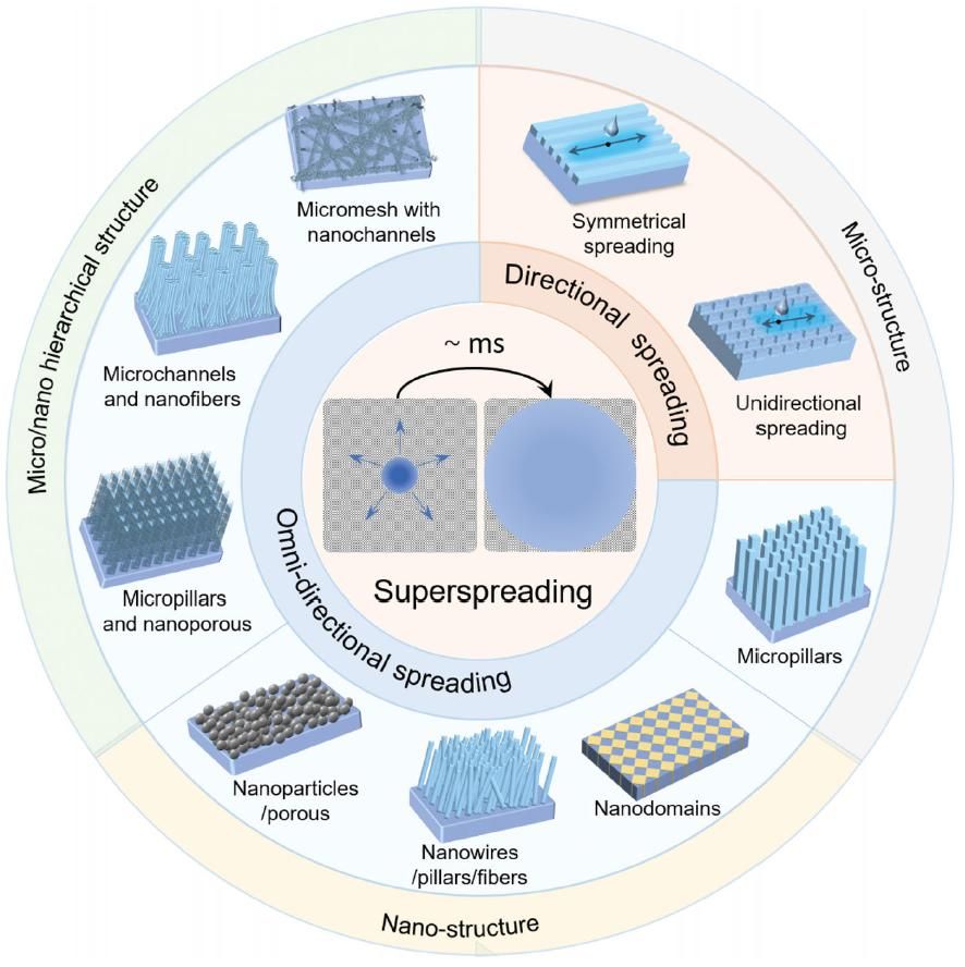 鞠婕教授与姚晰教授课题组在化学材料类顶级期刊Advanced Materials (Adv. Mater. 2025, 2501734, DOI: 10.1002/adma.202501734)上发表题为“Recent Progress on Liquid Superspreading and Its Applications”的综述论文,系统总结了超铺展表面的设计原理,重点探讨了界面能调控和微结构优化的协同作用机制,并详细阐述了该技术在热管理、海水淡化、薄膜制备和生物医学检测等领域的创新应用。