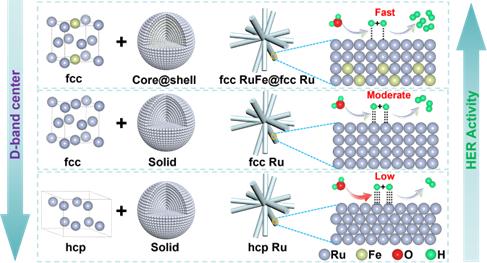 针对这一挑战,白锋教授团队创新性地利用面心立方Fe团簇作为种子,外延生长亚稳相fcc结构Ru,并构筑了核为fcc RuFe合金、壳为fcc Ru的独特核壳结构(fcc RuFe@fcc Ru)。与传统的密排六方相核壳结构(hcp RuFe@hcp Ru)以及常规hcp RuFe合金相比,该新型催化剂显著优化了*H的吸附能力。深入研究表明,得益于fcc相Ru和核壳结构的协同作用,催化剂的d带中心明显下移,电子结构得到有效调控,从而优化了关键中间体*H的吸附能力,大幅提升了HER本征活性和稳定性。