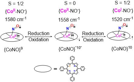 段鹏程教授和白锋教授利用弱配位场硫代卟啉大环作为类血红素模型,成功分离出一系列前所未有的完整{CoNO}n(n = 9和10,Enemark-Feltham表示法)配合物及一种标记为{CoNO}”10”的{CoNO}9-硫代卟啉自由基复合物。此外,研究发现{CoNO}9配合物与Ph3CSNO和PhNO反应可生成钴-C-二氮烯二醇酯类血红素复合物,这为在血红素模型中获取次亚硝酸盐类似中间体提供了新途径。