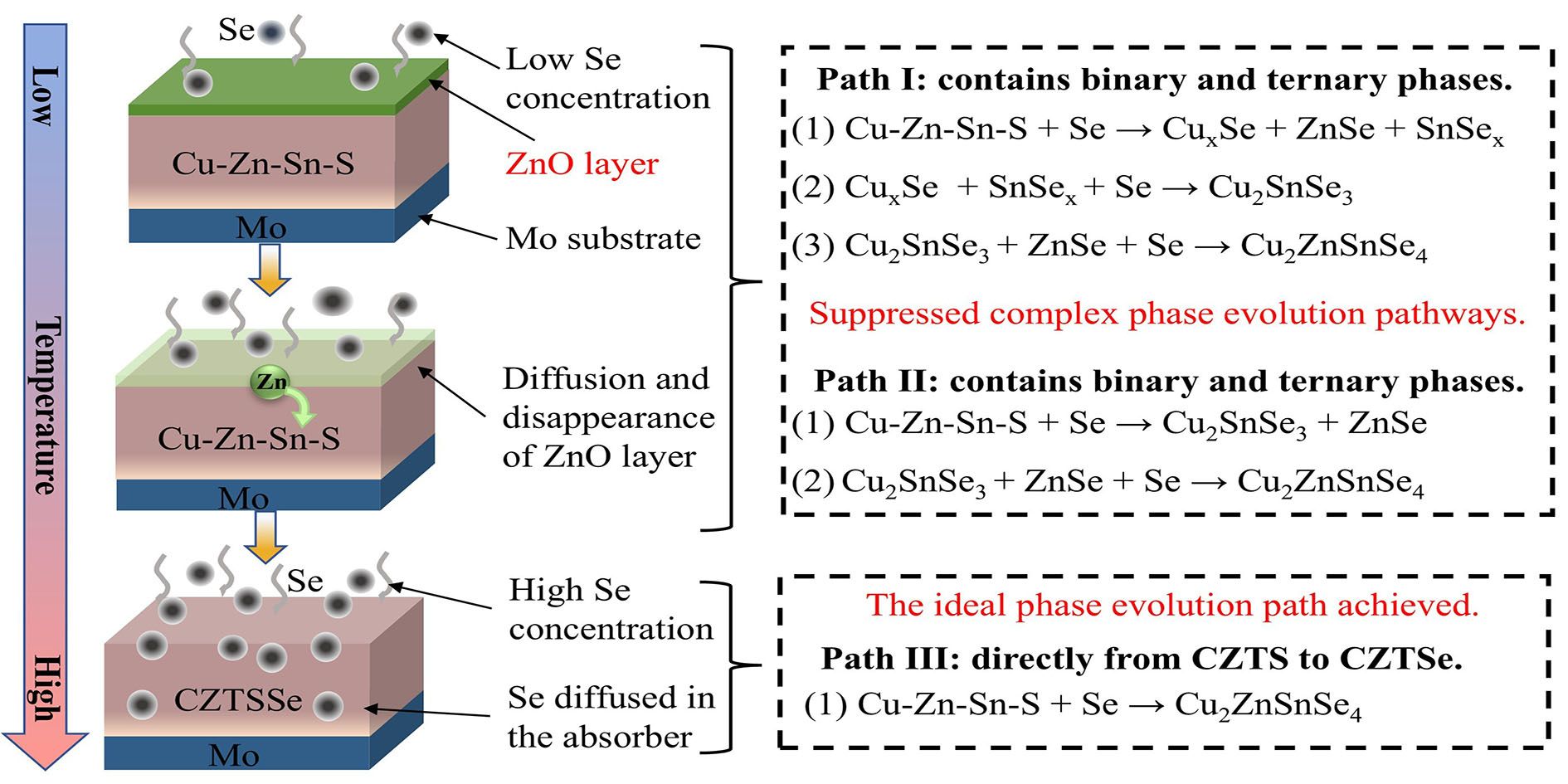CZTSSe吸收层在硒化过程中复杂的相变路径,会引发大量二次相和深能级缺陷的形成,严重阻碍了CZTSSe太阳能电池效率的进一步发展。为了解决这一问题,武四新课题组通过在CZTS前驱体上实施ZnO界面阻挡层,以调控硒化前期CZTS到CZTSSe的相变路径。该阻挡层在低温下可以保持稳定,有效地防止了前驱体和低浓度硒之间的接触和反应,从而抑制了复杂的相演化路径。随着温度的升高,ZnO层逐渐分解并扩散消失,使CZTS可以在高温下直接与高浓度Se反应,发生一步相变,形成纯净的CZTSSe相。通过该策略制备的CZTSSe薄膜,不仅结晶性良好、无二次相且具有更少的缺陷。因此,其带尾态效应和载流子非辐射复合被显著抑制,载流子传输和提取得到了有效增强。最终,实现了效率为14.45%,VOC为572.6 mV的CZTSSe太阳能电池。这一研究成果为吸收层相变路径的调控提供了新的思路,对于进一步提升锌黄锡矿太阳能电池的效率具有重要意义。
