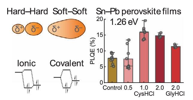 李萌教授团队首次提出用“硬-软酸碱(HSAB)原理”定向调控Sn-Pb混合钙钛矿前驱体溶液中的金属中心物种。在钙钛矿前驱体溶液中引入同时带有硬碱(羧基,-COOH)与相对软碱(巯基,-SH)的盐酸半胱氨酸(CysHCl),以分别偏好作用于较“硬”的Sn²⁺与较“软”的Pb²⁺,实现对两类金属物种的调控。最终,经CysHCl改进后实现了光电转换效率为23.3%的铅锡钙钛矿太阳能电池器件,且在25℃下对最大功率点追踪285h后仍有初始效率的80%,在65℃下对最大功率点追踪180h后仍有初始效率的80%。这项工作提出了一种以硬-软酸碱原理为基础的简便方法,能够根据金属物种的性质在溶液中进行针对性选择,这为金属相关的化学研究提供了广泛的适用性。(DOI: 10.1002/anie.202514010)
