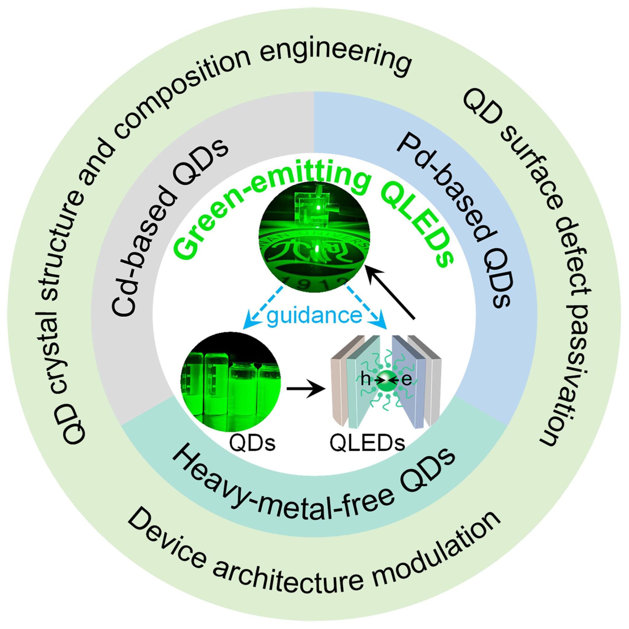胶体量子点发光二极管(QLED)作为新一代固态照明与全彩显示技术的核心候选技术,长期以来备受学术界和产业界的广泛关注。其中,绿色QLED因其发射光谱与人眼视觉灵敏度高度匹配,在显示和照明领域展现出独特的应用优势。尽管绿色QLED在效率、亮度和寿命等关键性能指标上已经取得显著进展,然而针对绿色QLED的系统性总结工作仍然较为匮乏。这一研究空白不仅限制了高性能绿色QLED的后续发展,也阻碍了相关领域人员对该领域技术发展方向的清晰认知。在本论文中,作者聚焦于绿色QLED器件,基于发光材料分类方法,系统梳理了镉基量子点、铅基钙钛矿量子点以及无重金属量子点在绿色发光器件中应用的研究进展;重点阐述了提升器件性能的关键因素及有效策略,并揭示了其内在作用机制;对比分析了不同体系量子点绿光器件的发光机理与技术特点;最后,深入探讨了绿色QLED领域当前面临的主要挑战与未来机遇,指出了领域的关键性科学问题并给出了相应的可行性解决方案。本综述性工作将为绿色QLED的未来发展提供有价值的理论指导和实践借鉴。