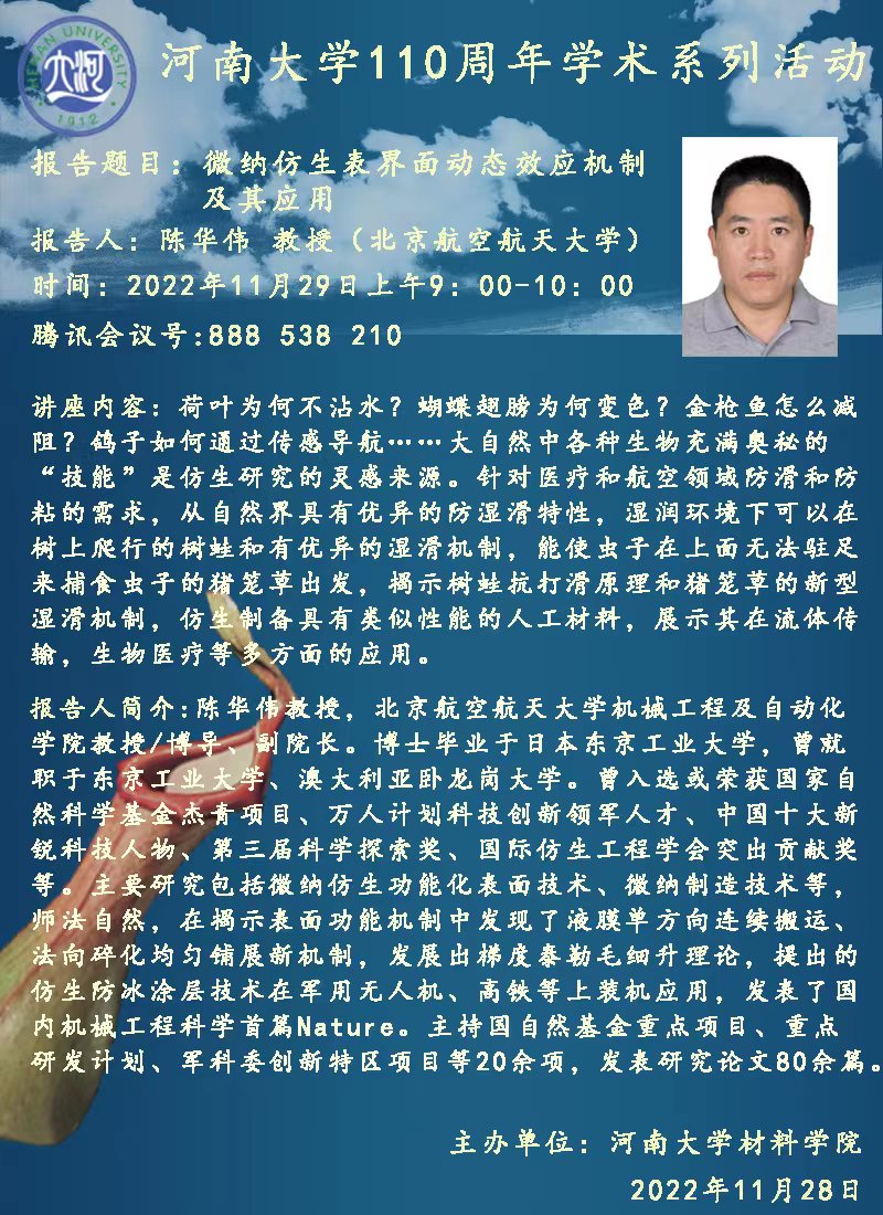 陈华伟:微纳仿生表界面动态效应机制及其应用(时间11.29)