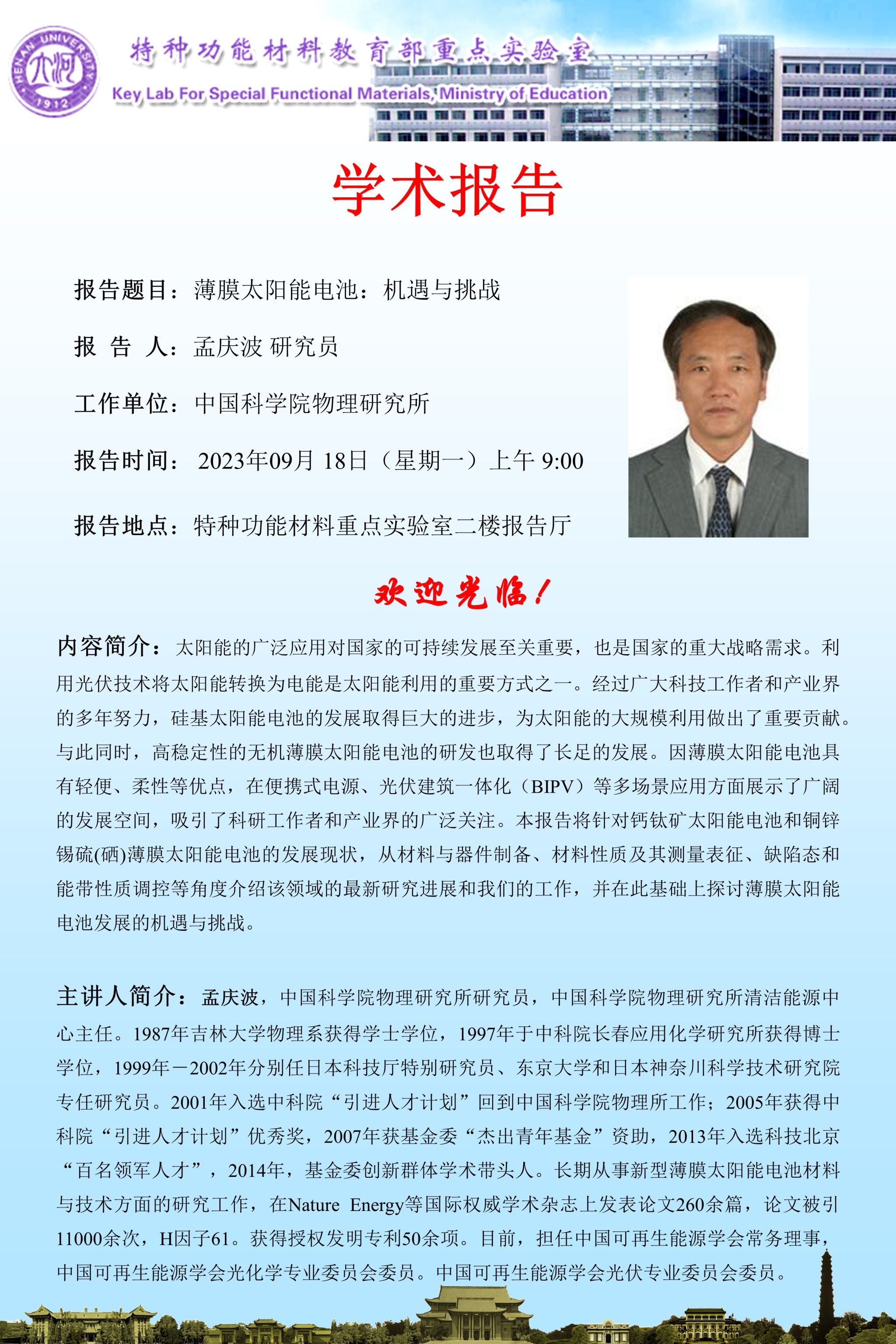孟庆波:薄膜太阳能电池:机遇与挑战(时间9.18)