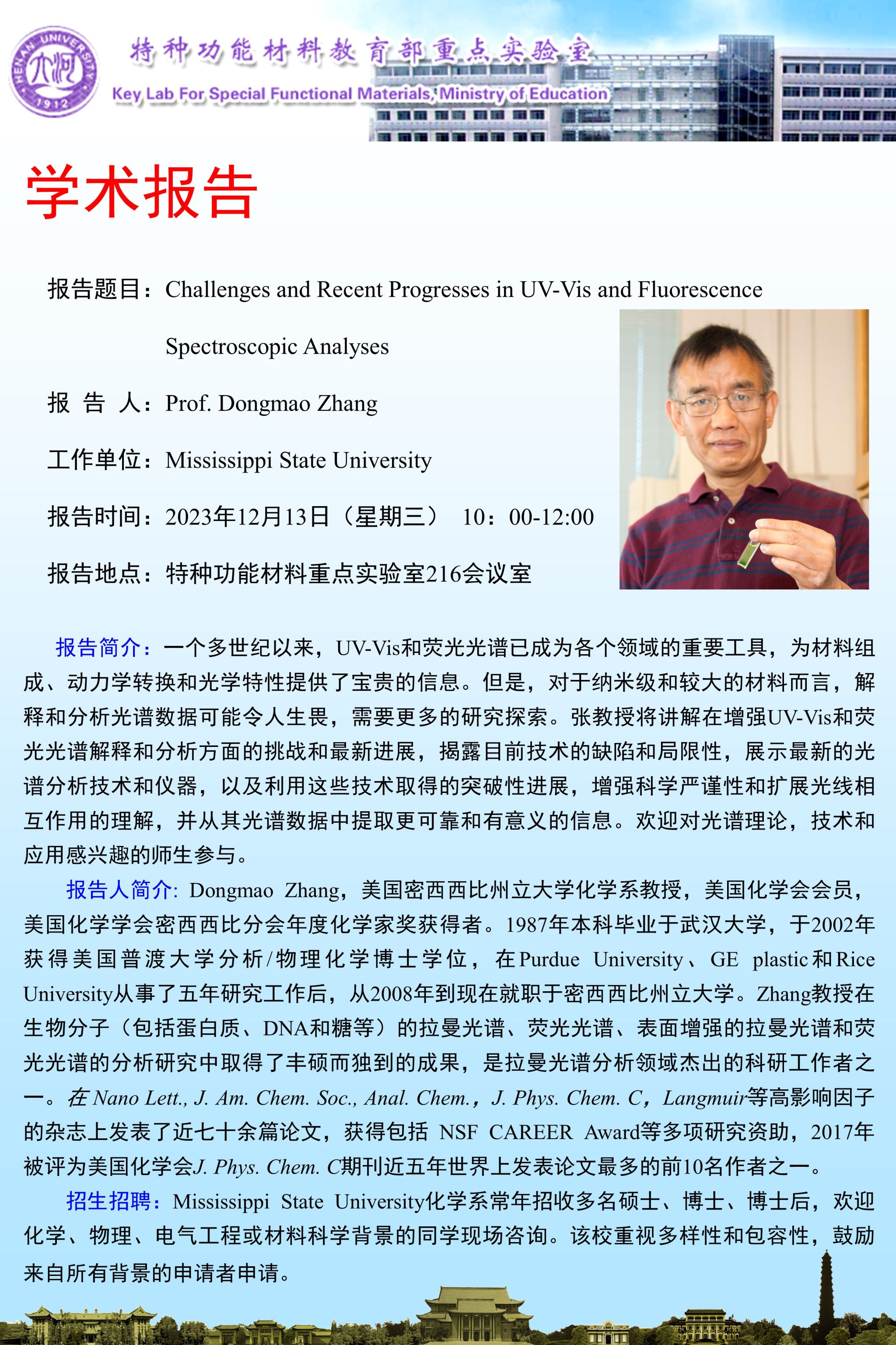 Dongmao Zhang:Challenges and Recent Progresses in UV-Vis and Fluorescence Spectroscopic Analyses(时间12.13)