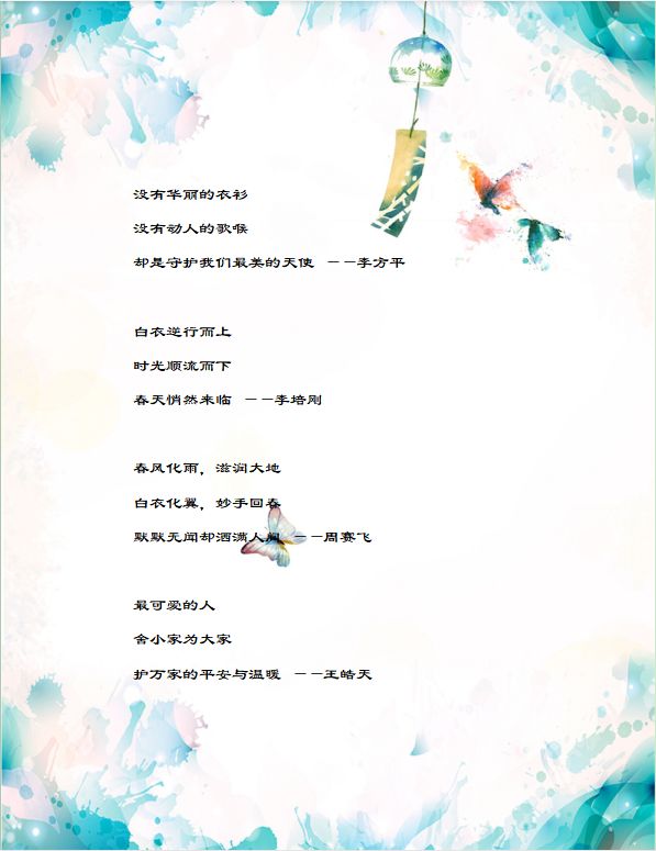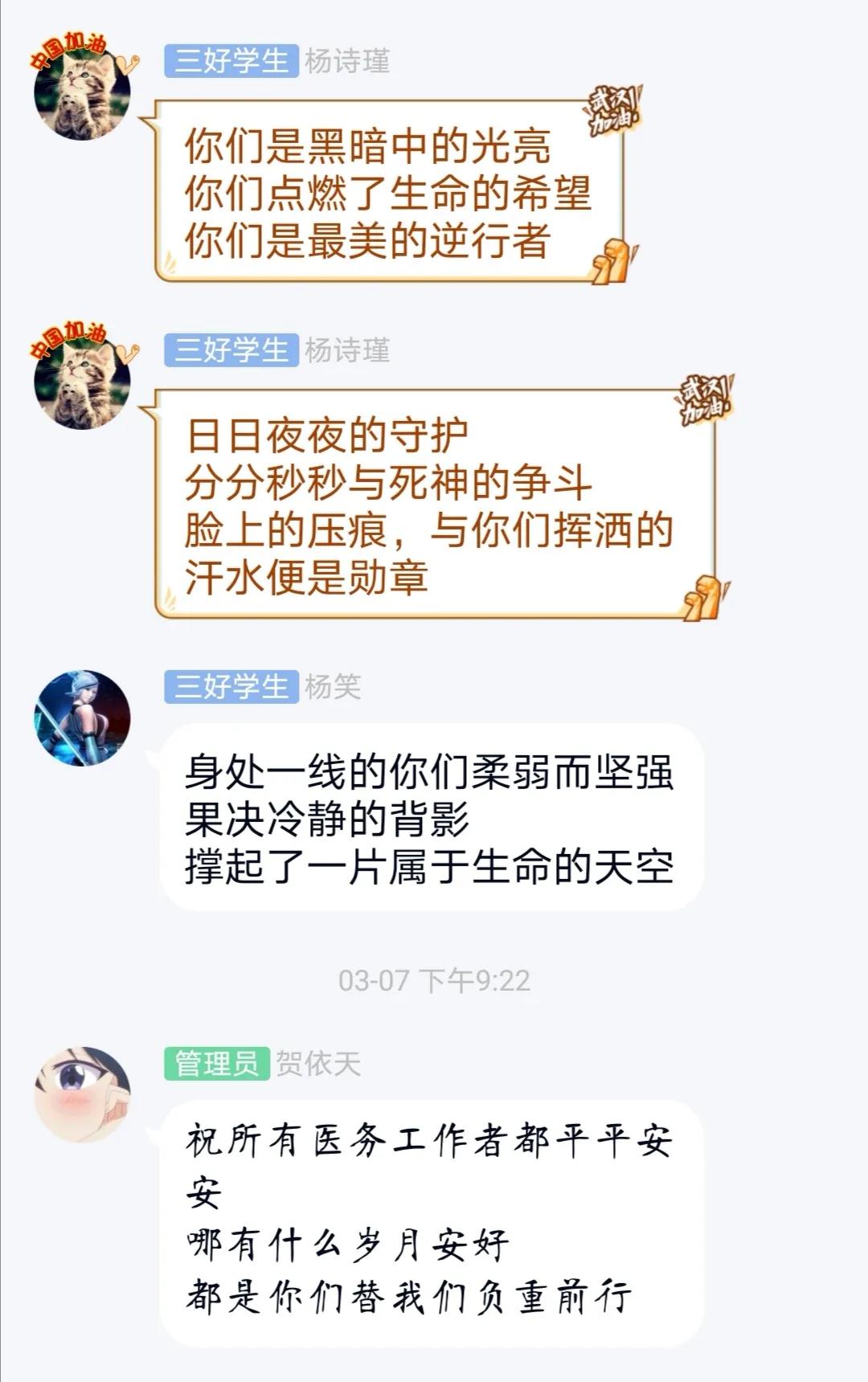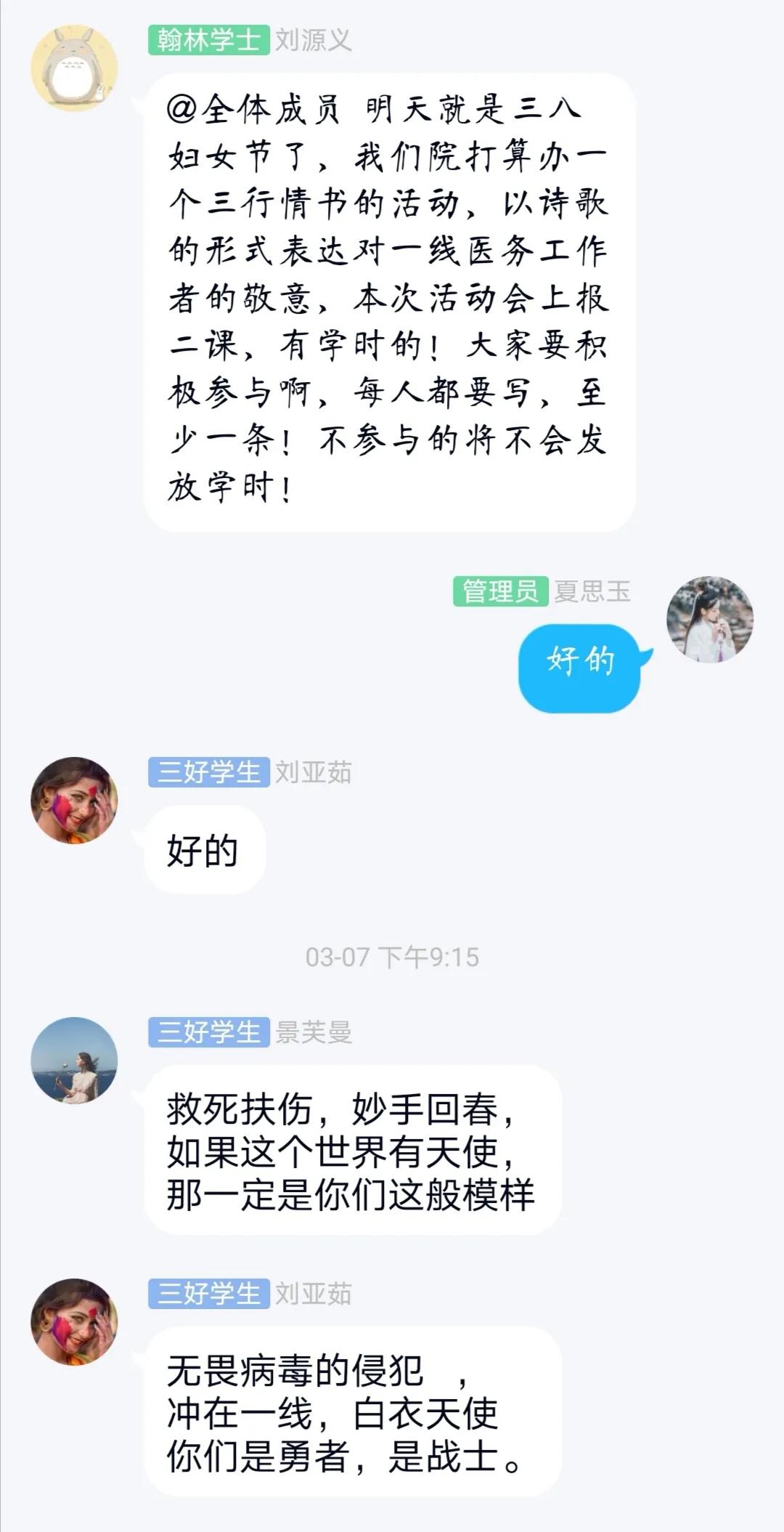 日前,习近平总书记强调,“当前,疫情防控正处于关键时期。”作为一名大学生团员,虽然在家学习,但心系疫情,时刻关注着“疫”情情况,也被无数英雄感动。因此,草莓视频 2019级本科生团支部特开展了一次以“三行情书——向抗‘疫’英雄致敬”为主题的团日活动。本次活动团员学生通过“三行情书”的形式向英雄们表达敬意,诉说真情。