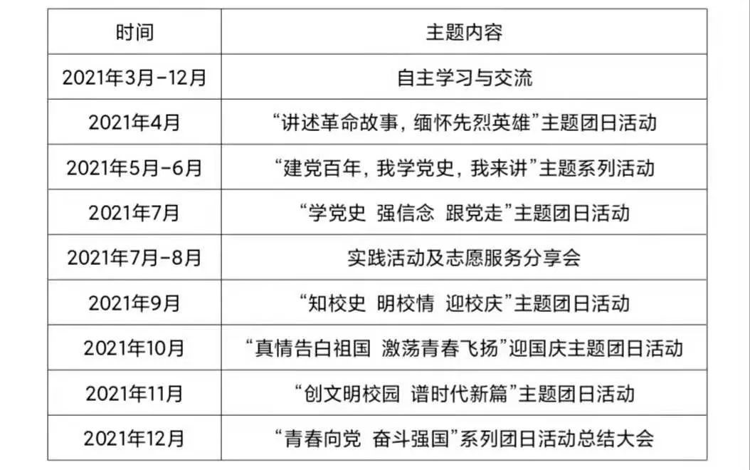 坚持以马克思列宁主义、毛泽东思想、邓小平理论、“三个代表”重要思想、科学发展观、习近平新时代中国特色社会主义思想为指导,深入学习贯彻党的十九大和十九届二中、三中、四中、五中全会精神,紧密结合共青团工作和团员青年实际,坚持团员自学和支部组织学习相结合,坚持理论学习和实践教育相结合,在全校范围内广泛开展形式多样、内容丰富的系列活动,教育引导广大团员青年感悟党的初心使命、了解光辉校史,激发青年学子的爱国荣校热情,更加自觉地以习近平新时代中国特色社会主义思想武装头脑,进一步增强“四个意识”、坚定“四个自信”、做到“两个维护”,把自身成长与学校事业、国家发展同频共振,坚定不移跟党走中国特色社会主义道路,为全面建设社会主义现代化国家、实现中华民族伟大复兴中国梦贡献青春力量。