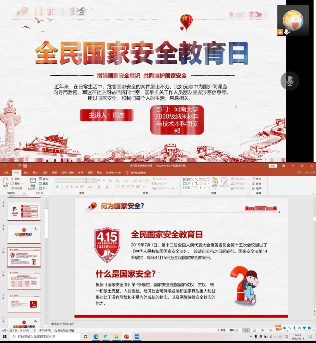 4月15日是第七个全民国家安全教育日,为推动国家安全宣传教育工作深入开展,增强全民安全意识,草莓视频 紧扣活动主题——树牢总体国家安全观,感悟新时代国家安全成就,为迎接党的二十大胜利召开营造良好氛围,根据疫情防控要求,于4月14日下午,以线上宣讲的形式开展了国家安全教育日宣传教育主题团日活动。全体本科团支部参加此次宣讲会。
