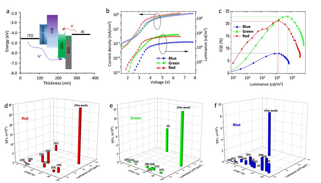 (图2. 红绿蓝三色QLED器件性能图与已有工作比较)